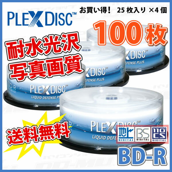 【記録メディア】【送料込み】 【100枚=25枚スピンドルケース×4個】 【送料無料】 PLEXDISC BD-R データ&デジタルハイビジョン録画対応 25GB 1-6倍速 100枚(25枚×4個)スピンドルケース 耐水光沢写真画質ワイドホワイトレーベル (633-C13 4個セット)【RCP】