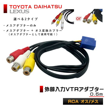 端子形状 RCA オス/メス 全長 50cm ● トヨタ/ダイハツ/LEXUS 純正ナビゲーションに地デジチューナー・DVDプレーヤー・ビデオカメラ・ゲーム機など このVTRアダプターを取り付ける事によりナビゲーションに「映像・音声」の入力を可能にする配線キットです ● 取付はカプラーオン(コネクター)ですので、ナビゲーション本体を車両から取り外す事が出来れば、 あとは純正ナビの外部入力端子に差し込むだけですので、配線加工をせずに簡単に取付が出来ます ● 配線の加工を行わないので必要がなくなれば、すぐに元の状態に戻せます ● 既に映像入力端子などの外部入力がある車両には取付出来ません (モニター画面に"VIDEO"や"VTR"の表示される車両も使用出来ません) ● 外部入力アダプターを差し込むと、テレビ選局画面内(タッチパネル)に"VIDEO"と表示されますので その表示部をタッチするとテレビ/外部映像の切替が出来ます ★