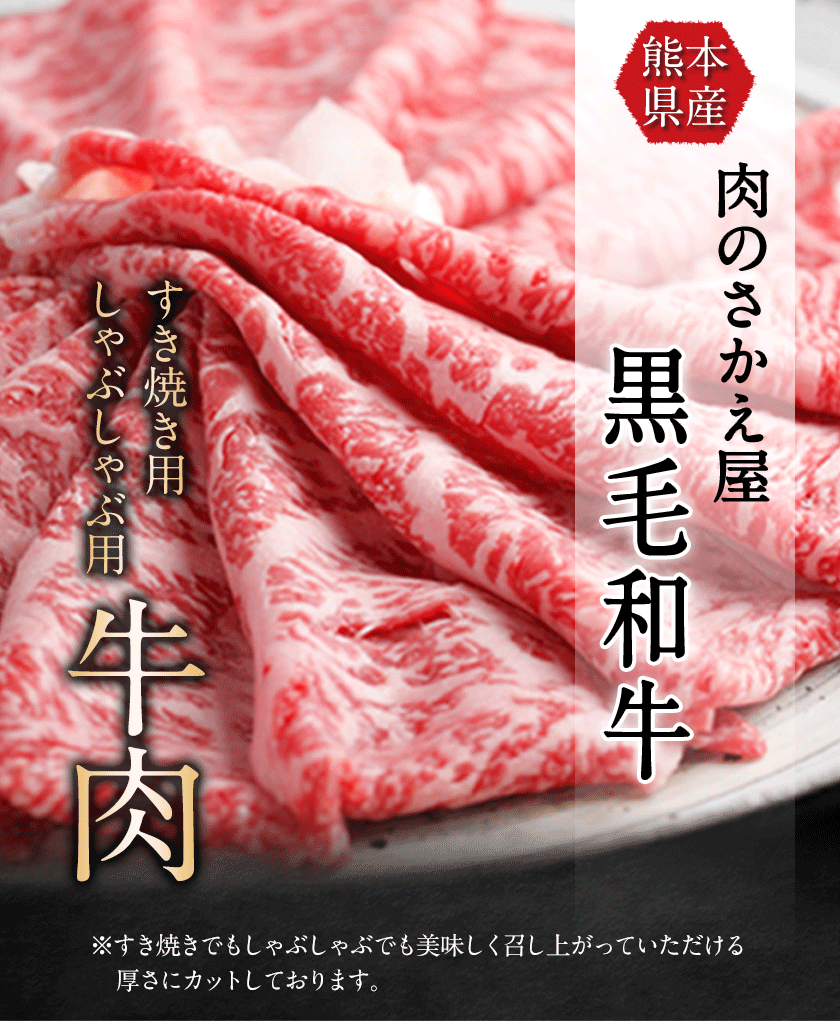 商品情報 すき焼き・しゃぶしゃぶ用 熊本県産(黒毛和牛) 名称 牛肉 産地 熊本県産 内容量 すき焼き・しゃぶしゃぶ用 牛肉(モモ)約1kg 販売者 肉のさかえ屋 賞味期限 返礼品ラベルに記載 保存方法 -18度以下で冷凍 配送方法 冷凍便でお届けします。