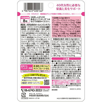 【主要成分】8粒(2.0g)中:V.A 550㎍、V.B1 1.1mg、V.B2 1.2mg、V.B6 1.2mg、ビオチン 170㎍、V.B12 2.4㎍、V.C 500mg、カルシウム 100mg、鉄 4.3mg、マグネシウム 29mg、グレープシードエキス 14.25mg、コラーゲン 100mg、システイン 10mg、乳酸菌 170億個、イチョウ葉エキス 10mg、ナットウキナーゼ 500FU、マカ(生換算) 100mg、ブルーベリーエキス(アントシアニン36%) 20mg、プラセンタ(生換算) 100mg、α-リポ酸 3mg、植物酵素エキス 10mg、酵母 31mg、ヒアルロン酸 20mg 【栄養成分】8粒(2.0g)中:エネルギー 7kcal、たんぱく質 0.22g、脂質0.09g、炭水化物1.37g(糖質1.12g、食物繊維0.24g)、食塩相当量0.01g 【賞味期限】2年 【1粒重量】250mg 【形状】タブレット 【保存方法】高温・多湿、直射日光を避け、涼しい所に保管してください。