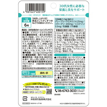 【主要成分】6粒(1.5g)中:V.B1 1.1mg、V.B2 1.2mg、V.B6 1.2mg、ビオチン 200㎍、V.B12 2.4㎍、V.C 500mg、カルシウム 58mg、鉄 4.2mg、マグネシウム 29mg、亜鉛 0.7mg、グレープシードエキス 14.25mg、コラーゲン 200mg、システイン 3.5mg、乳酸菌 170億個 【栄養成分】6粒(1.5g)中:エネルギー 5kcal、たんぱく質 0.26g、脂質0.02g、炭水化物0.98g(糖質0.85g、食物繊維0.13g)、食塩相当量0.005g 【賞味期限】2年 【1粒重量】250mg 【形状】タブレット 【保存方法】高温・多湿、直射日光を避け、涼しい所に保管してください。
