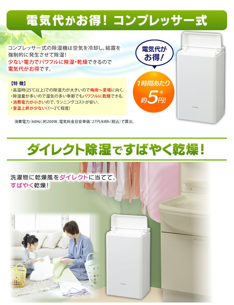 ●商品サイズ(cm) 幅約30×奥行約22.5×高さ約52.5 ●重量 約13.3kg ●材質 ABS樹脂、ポリプロピレン ●電源 AC100V(50/60Hz共用) ●定格消費電力 50Hz:160W 60Hz:200W ●定格除湿能力(※1) 50Hz:約7.3L/日 60Hz:約8.3L/日 ●除湿可能面積の目安(※2) 【50Hz】 木造:9畳(15平方メートル) プレハブ:14畳(23平方メートル) 鉄筋:18畳(30平方メートル) 【60Hz】 木造:10畳(17平方メートル) プレハブ:15畳(25平方メートル) 鉄筋:20畳(33平方メートル) ●タンク容量 約2.3L ●電源コードの長さ 約1.8m ※1…定格除湿機能力は、室温27℃、相対湿度60%を維持し続けたときの、1日(24時間)あたりの除湿量です。
