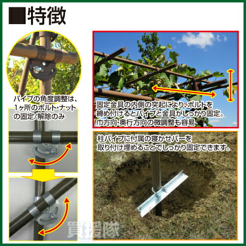 納期について:メーカー直送品(代引き不可)【ぶどう棚 藤棚 ふじ棚 葡萄棚 園芸棚 菜園 棚 支柱 園芸 用品 つる ヘチマ キウイ 栽培 格子棚 軒下 ツル 積水樹脂】 ■組立・調整・設置が簡単!ブドウ、キウイなどの栽培棚に! ■つる性の果樹やつる性の作物をきれいな棚仕立てにできます ■棚部材の支柱素材は、本格派好みの木調色 ■固定金具は、1ヶ所のボルト締めで、角度・位置調整が容易にできます ■基礎部に関し、柱パイプに付属の寝かせバーを取り付け埋めることでしっかり固定できます 特徴 仕様 品名 フルーツパーゴラDX 品番 SEKISUI-100897 メーカー セキスイ(積水樹脂) 製品サイズ(組立時) W300×D180×H200cm 製品サイズ(支柱ピッチ) W240×D130cm 色 支柱:木調、固定金具:ブラウン/ボルトナット:めっき色 材質 樹脂被覆鋼管支柱:スチール・PE樹脂/固定金具・フックバンド:亜鉛めっき鋼板、バネ鋼線、 PE樹脂コーティング セット内容 棚枠パイプ:2本 / 33mm×3.0m 枠柱パイプ:4本 / 33mm×2.4m かもいパイプ:2本 / 33mm×1.5m ほおずえパイプ:4本 / 33mm×1.2m 棚パイプ(長):8本 / 20mm×1.8m 棚パイプ(短):12本 / 20mm×1.2m 固定金具:16組 / φ33用 フックバンド(大):8本 / 33×20用 フックバンド(小):48本 / 20×20用 L字アングル:4本 / L=300mm U字ボルト・ナット:4ヶ / φ32用 重量 約33kg JANコード 4906648100897