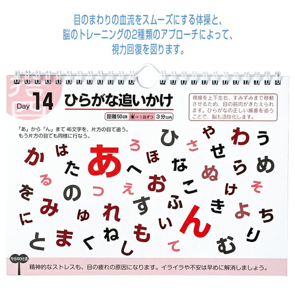 ■商品情報 商品名[PHP その他 書籍・DVD]1日3分!視力回復日めくり(81359) メーカー名PHP カラー─ サイズ縦187mm×横257mm サイズ縦18.7cm×横25.7cm31日分17枚綴(表紙含む) ■メーカー希望小売価格はメーカーカタログに基づいて掲載しています 関連商品 骨盤ストレッチ日めくり(80471)1080円 子育て日めくり 「こうすれば子どもはちゃんとききわける」(80475)972円 子育て日めくり 「お母さんのガミガミが子どもをダメにする」(79270)972円 日めくり 断捨離すれば、片づいた。