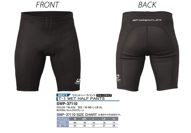 SPYDER FLEX S/F T-1 ウェットハーフパンツ/スパイダーフレックス インナーパンツ サイズ M,MB,L,LB,XL 素材 2mmクロロプレーン カラー BLACK サイズ サイズ ウエスト 股下 M 約64cm 約25cm MB 約70cm 約25cm L 約72cm 約27cm LB 約78cm 約27cm XL 約77cm 約28cm メーカー希望小売価格はメーカーカタログに基づいて掲載しています。